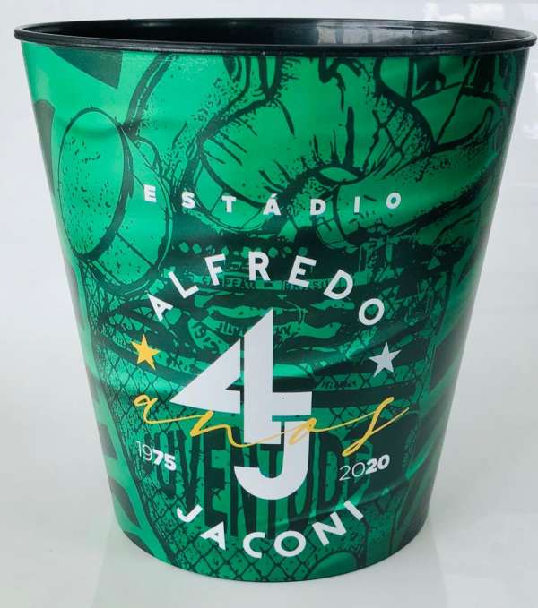 Balde plástico, com diâmetro de 17 (cm), produzido em plástico para produtos comestíveis, com imagem exclusiva, alusiva aos 45 anos da reinauguração do Estádio Alfredo Jaconi, do Esporte Clube Juventude, de Caxias do Sul / RS.